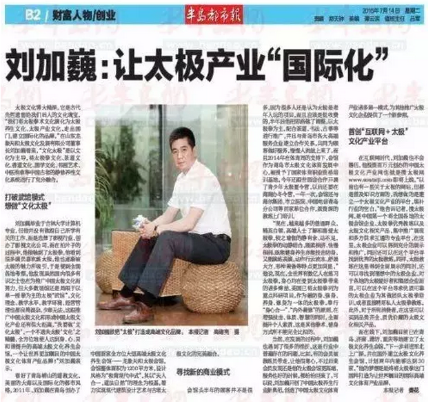 他酷爱太极,以推广中国太极文化为使命;他有胆有识,敢于创新,打破传统太极武馆的模式,建立了太极文化产业平台,四年来,他屡次创新,引领中国太极文化产业新模式!他长年无休,以办公室为家,加班到夜里两三点是正常事儿……他就是刘加巍,山东龙象天和太极文化发展有限公司董事长,他虽然不是太极拳传人,却是太极文化的推手,中国太极文化体育产业的领航者。