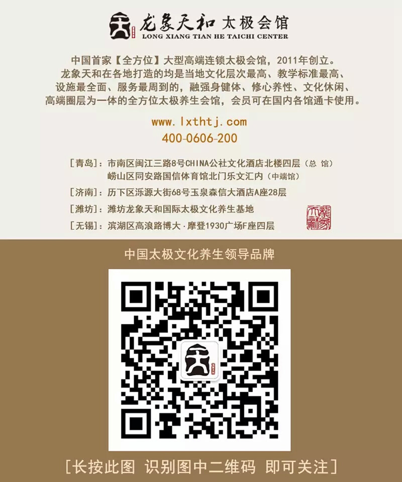龙象天和太极会馆,我们倡导“文化太极”,全方位地传承和渗透太极文化!我们没有门派之分,我们海纳国内外太极拳各门派优秀明师,优势互补、和谐发展、共同进步!教学上,我们融众派之所长,在保持传统太极拳的技击、文化及养生精华的同时,根据会员不同需求,研发制定了使会员更加清晰、全面、快速、准确掌握的《龙象天和太极教学标准体系》。