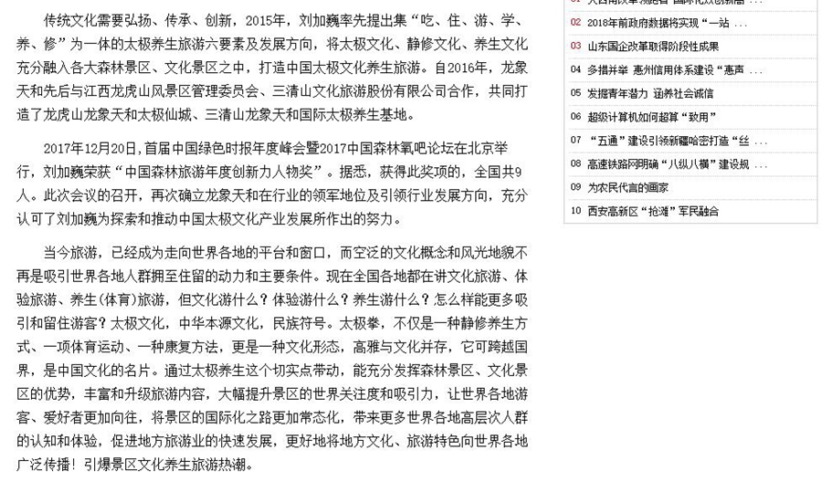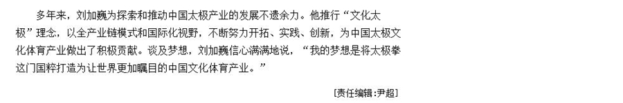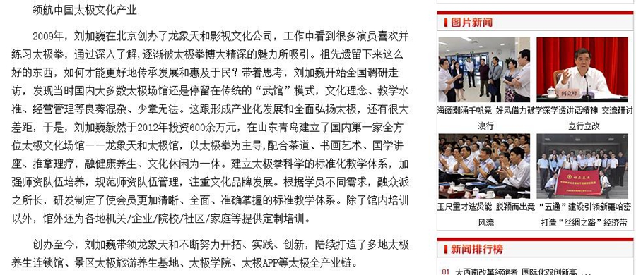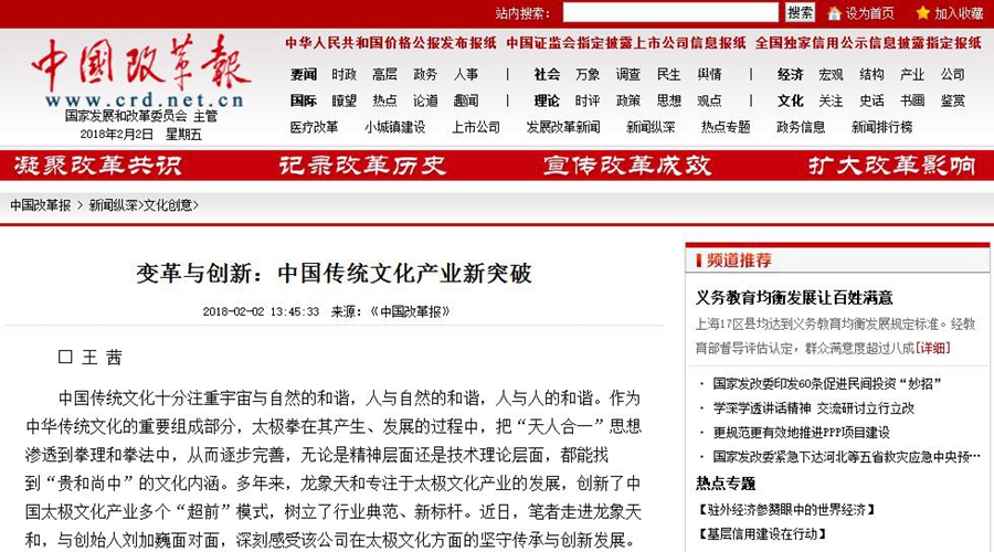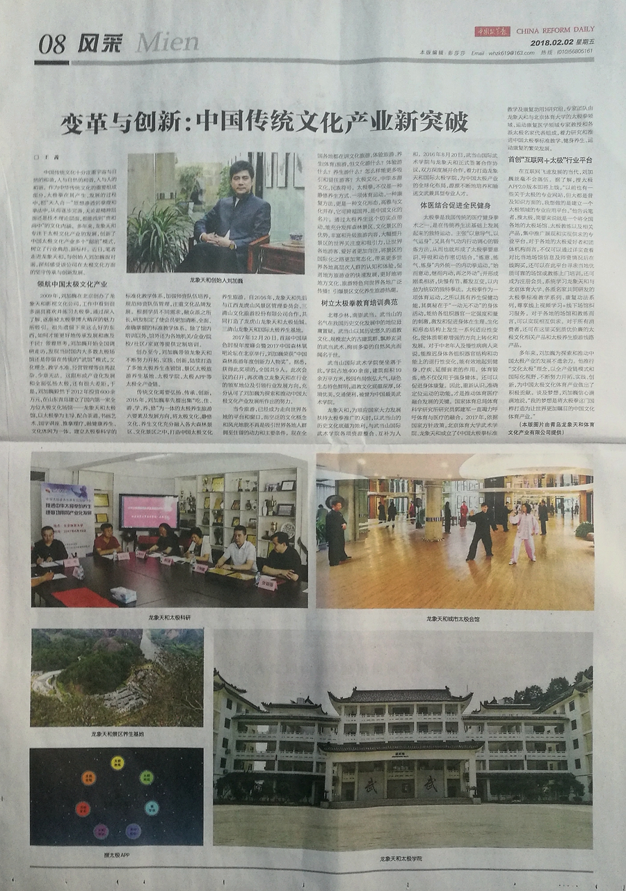 2018年2月2日,《中国改革报》对龙象天和及其创始人刘加巍-多年来通过创新的产业化运营理念和实践,为中国传统太极文化的传承推广和产业发展所做出的杰出贡献,进行了整版报道。同时,《中国改革报》官方网站也同步进行了全面报道。龙象天和,以“文化太极”理念、“运动养生”宗旨、“全产业链”模式,不断开拓、实践、创新,引领行业发展方向,打造中国太极教育培训、太极康复科研、太极康养旅游、太极互联网平台,开创了行业多个第一模式,树立了行业典范和标杆,领航中国太极文化产业。